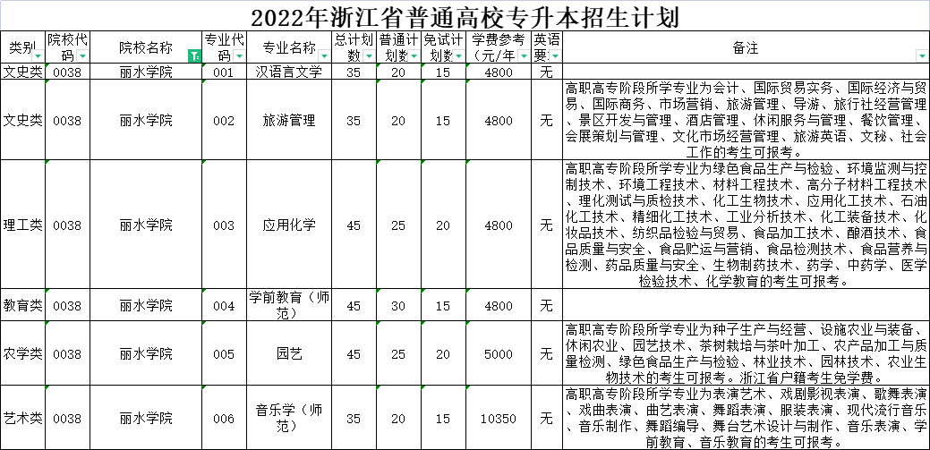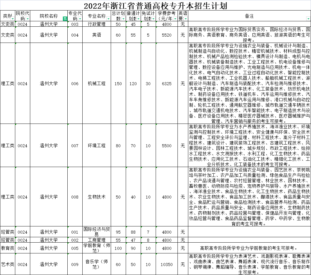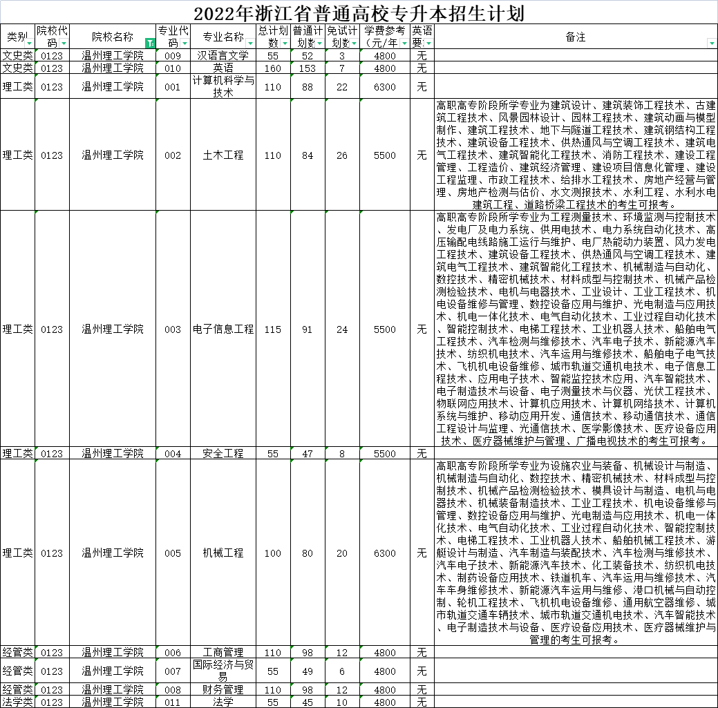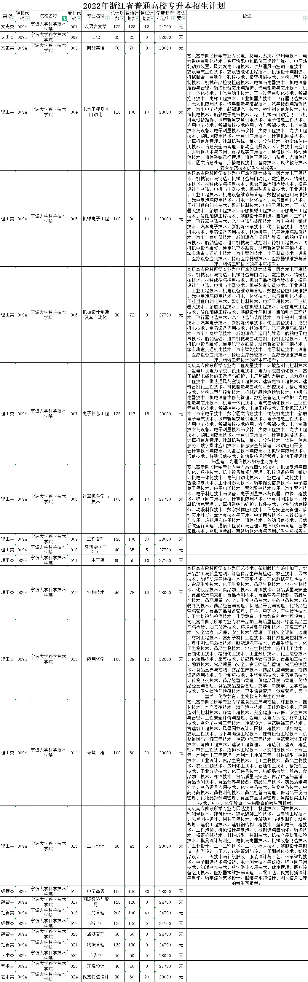 | 理工類 | 0020 | 杭州師范大學 | 008 | 環境工程 | 40 | 40 | 0 | 6000 | 無 | 高職高專階段所學專業為設施農業與裝備、農產品加工與質量檢測、綠色食品生產與檢驗、園林技術、工程測量技術、環境監測與控制技術、環境工程技術、安全健康與環保、安全技術與管理、工程安全評價與監理、材料工程技術、高分子材料工程技術、風景園林設計、園林工程技術、建筑工程技術、建筑設備工程技術、供熱通風與空調工程技術、建筑電氣工程技術、建筑智能化工程技術、消防工程技術、建設工程管理、工程造價、市政工程技術、給排水工程技術、水文測報技術、水利工程、水利水電建筑工程、理化測試與質檢技術、工業工程技術、化工生物技術、藥品生物技術、應用化工技術、石油化工技術、精細化工技術、工業分析技術、化工裝備技術、食品檢測技術、化學制藥技術、道路橋梁工程技術、化學教育的考生可報考。下沙校區就讀。 |