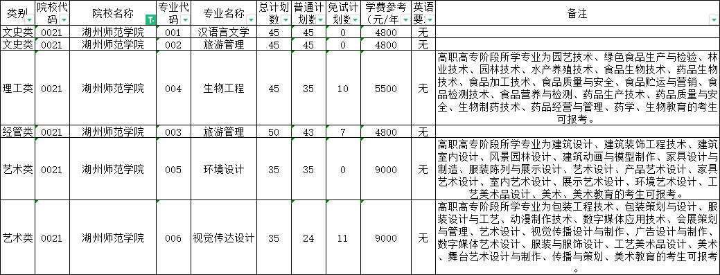 | 文史類 | 0020 | 杭州師范大學 | 001 | 英語 | 170 | 170 | 0 | 5300 | 無 | 高職高專階段所學專業為國際貿易實務、國際經濟與貿易、國際商務、英語教育、商務英語、應用英語、旅游英語的考生可報考。下沙校區就讀。 |