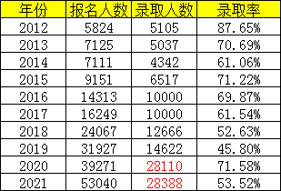 可以看到近幾年的一個通過率都是下降的,只有20年進行擴招之后才上升了,但是后續的21年又降了下來,能夠看出每年的通過率都是在50%左右,預計22年可能會有所下降,一方面是報考人數肯定是只增不減的,二則就是明年的一個擴招是否的問題,但是肯定會趕不上報考人數的。
